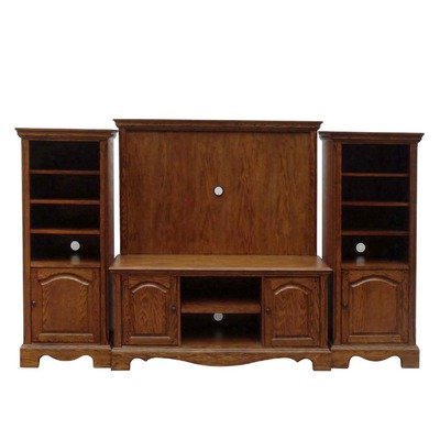 5538 Features : -Rich Multi Step Distressed Oak Finish. -Solid ash wood construction with oak veneers. -Entertainment credenza features two glass doors with an adjustable shelf in the middle and two doors with storage on the sides. -Console features an adjustable shelf in the middle and two doors with storage. -The entertainment pier features three shelves and a reversible door at the bottom and silver hardware. -Back panel attaches to the back of the country entertainment console and is not to be used to hang a TV. -Assembly required. Specifications : -Entertainment credenza dimensions : 36'' H x 60'' W x 20'' D. -Corner console dimensions : 26'' H x 68.25'' W x 24'' D. -Center console dimensions : 26'' H x 56'' W x 20'' D. -Casual pier dimensions : 60'' H x 24'' W x 18.25'' D. -Back panel dimensions : 34'' H x 56'' W x 1.5'' D..../ Country Casual Entertainment Center / Oak Veneer